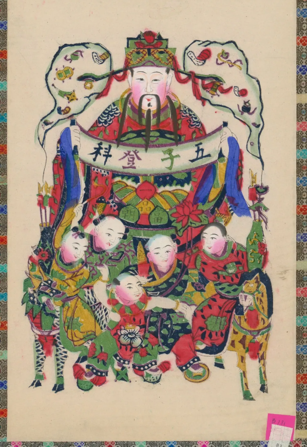 印版《五子登科文門神碼》,此幅為民間年畫,“五子登科”圖案有著吉祥的寓意,希冀多子多福,子嗣登科致仕,光宗耀祖。來源/故宮博物院
